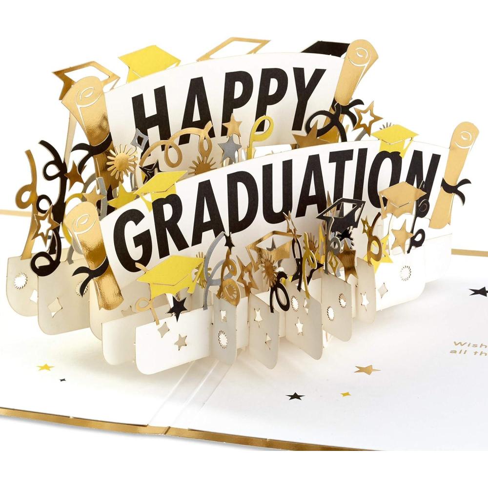 Pop-up graduation card features colorful mortarboard icons, a “Happy Graduation” message and a shiny gold border on the front. An intricate, three-dimensional design of a graduation banner, confetti, stars, mortarboards and diplomas pops out inside.