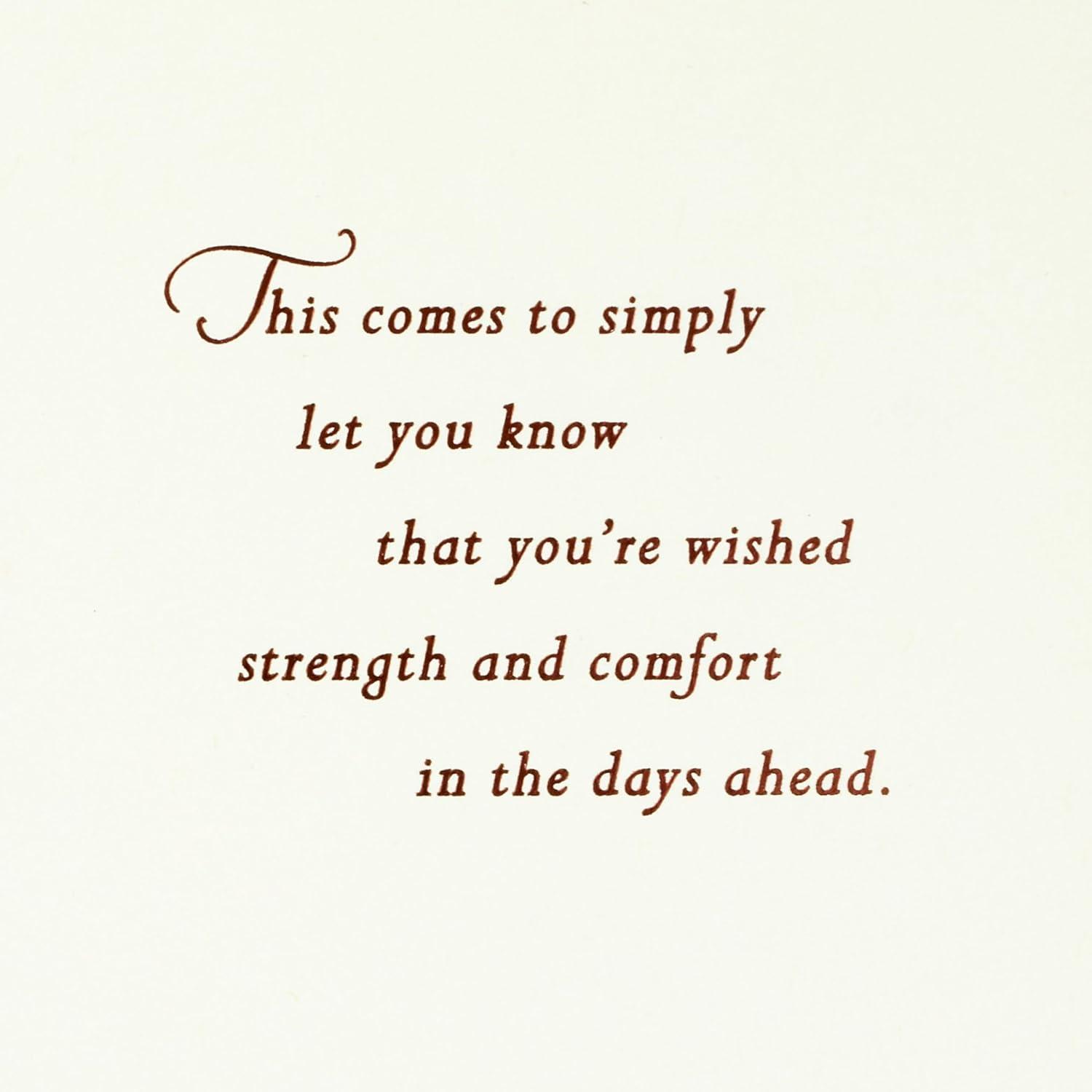 HALLMARK CARD: Cover features a painted white flower design, ribbon embellishment, and script lettering that reads: “There are no words to take away sadness when you lose someone you love.” Inside reads: “This comes to simply let you know that you're wished strength and comfort in the days ahead.” Sympathy card measures 5″ x 7.2″ and comes with a coordinating envelope.