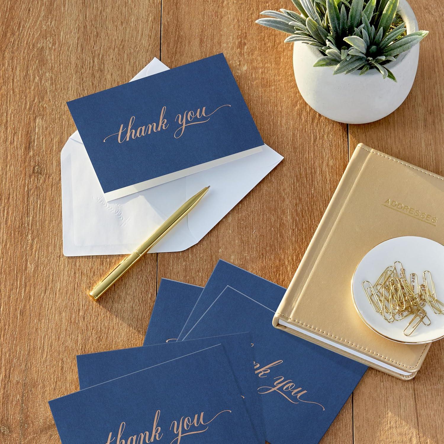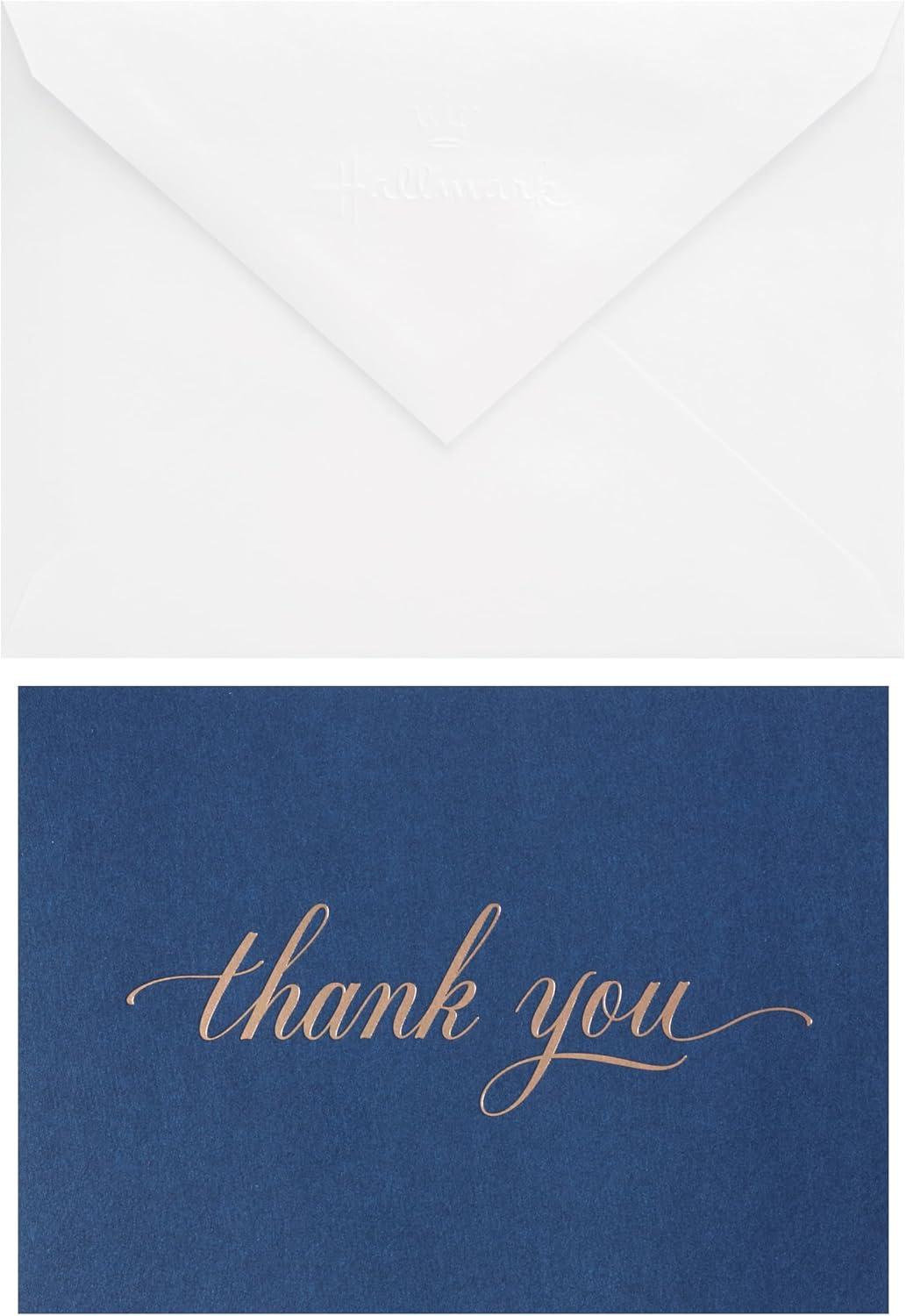 Cards feature silver foil script “Thank you” lettering on a navy blue background. Cards are blank inside for your personalized message.
