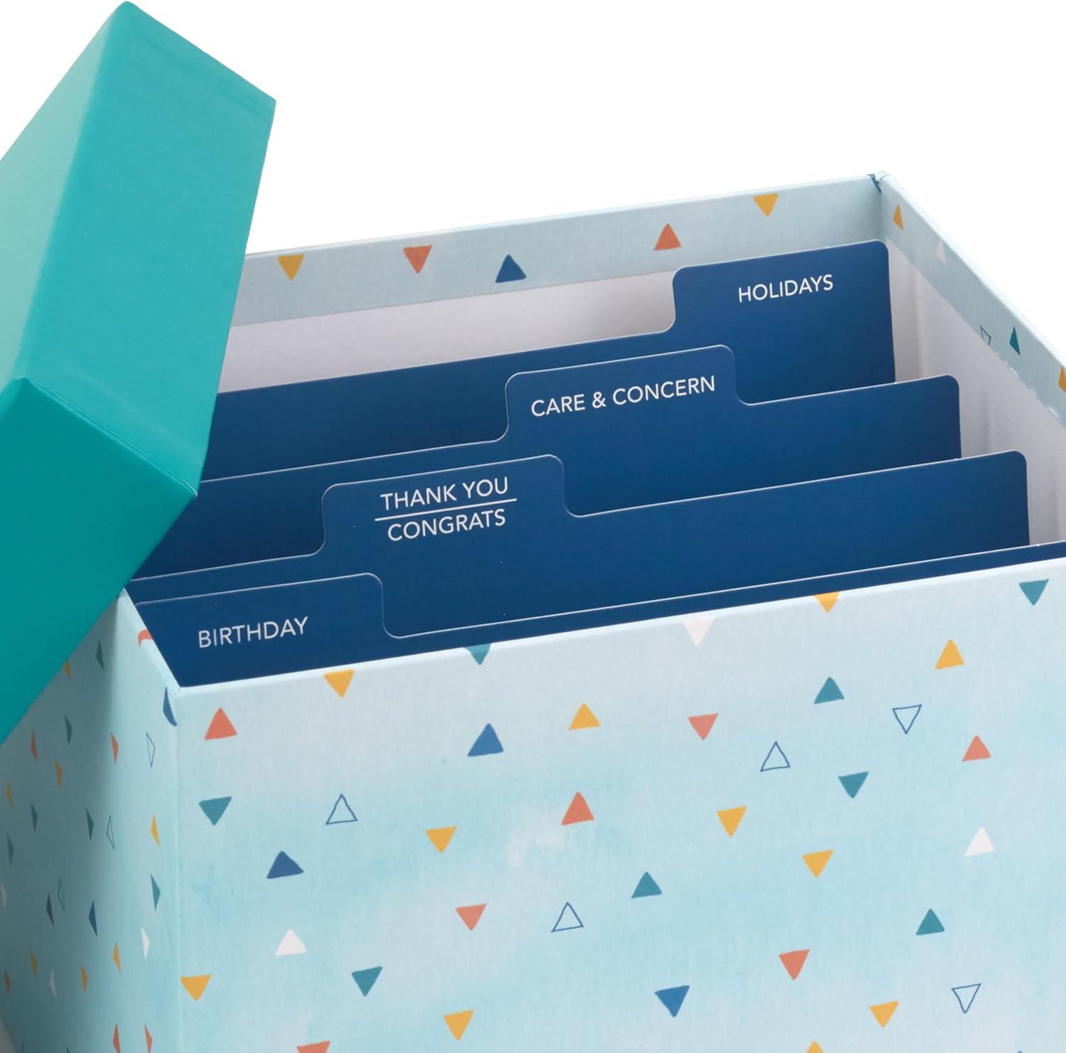 Cards measure 4″ x 6″ and come with coordinating envelopes, and a polka dot storage box with organizational dividers.