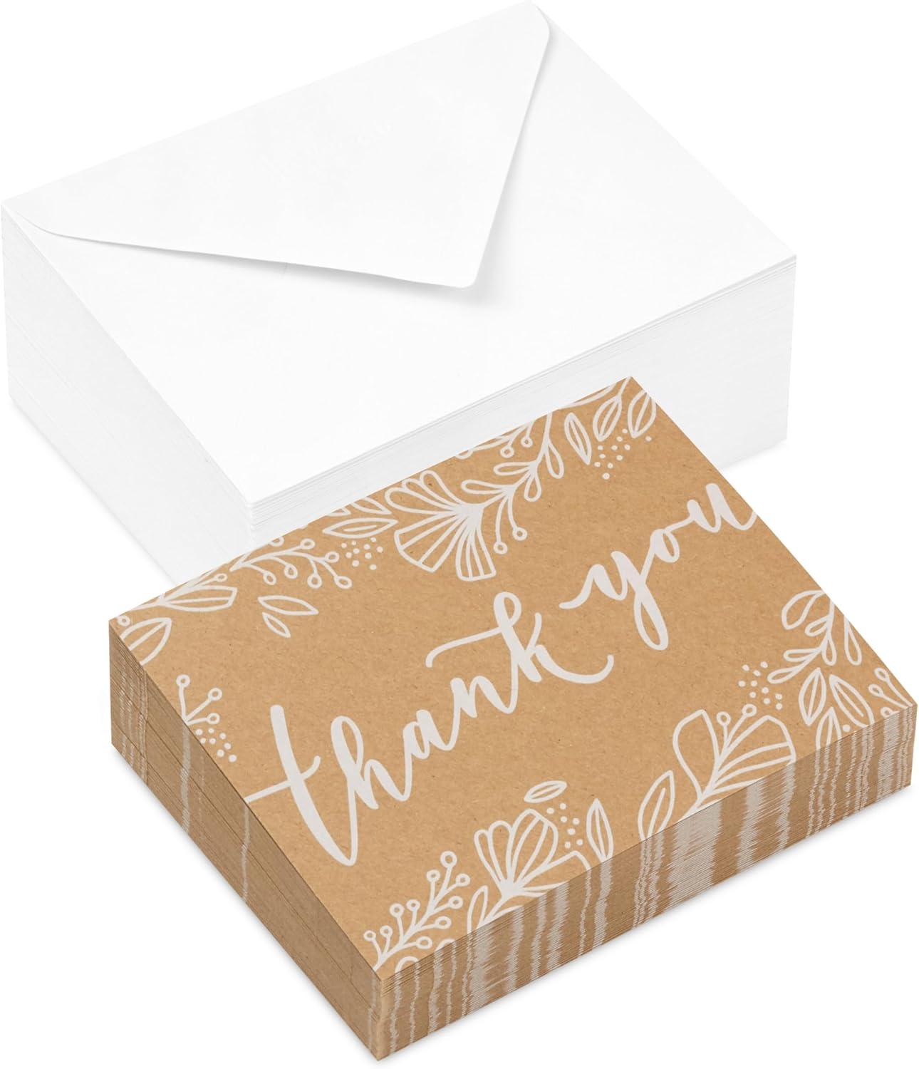 Set of thank you notes includes 100 cards in a single design with coordinating envelopes; front of kraft brown cards feature white “Thank you” script lettering with modern floral accents